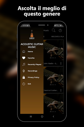 Questa app musicale è caricata con numerosi streaming radio con una varietà di stazioni radio di musica per chitarra acustica trasmesse 24 ore su 24, 7 giorni su 7.