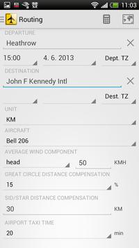 Based on user inputs of the departure and destination airports, and a required arrival time, or a required departure time - the app calculates the flight distance and time and the required departure time from the departure airport, or the planned arrival time at the destination airport. All times are given in both GMT and Local Time. The distance between the departure and destination airports can be compensated for departure and arrival routings (SID and STAR compensation) and ATC routing (great circle distance compensation in percent). The flight time can be compensated for aircraft average cruise speed (user entry), winds (head or tailwind compensation) and airport taxi times (user entry).