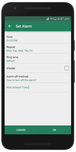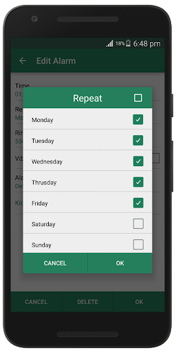 - REPEATING Alarm - Repeats on specific days, weekends, daily or never