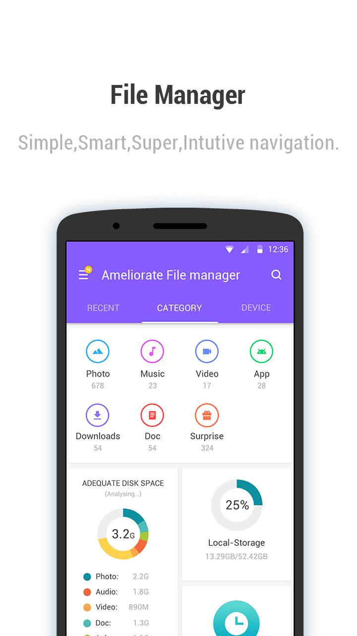 Ameliorate File Manager, the latest 2017 new version pro file manager app, helps you handle and share all your files stored in local storage and microSD card. With material design, Ameliorate File Manager is the best file manager and file transfer tools to make your Android easier.
