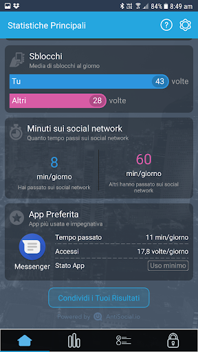 Una volta installato, AntiSocial lavora in modalità background sul tuo smartphone senza che tu nemmeno te ne accorga. Dopo 2 settimane, raccoglie tutti i dati relativi alla tua attività e fornisce un resoconto di facile comprensione.