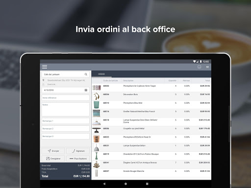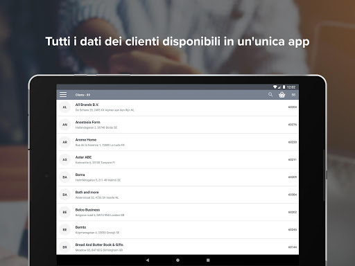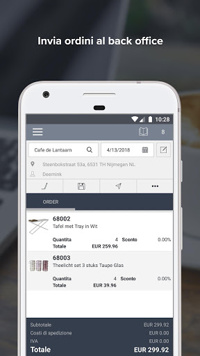 App4Sales è l'app perfetta per i tuoi rappresentanti di vendita, permettendo rapidi acquisti, ed essendo utilizzata da migliaia di rappresentanti di vendita. L'integrazione con il tuo sistema ERP consente di accedere al database completo dei clienti e di registrarne di nuovi. I rappresentanti hanno accesso ai propri clienti solo utilizzando le loro credenziali di accesso personali. Cerca nel catalogo digitale ed utilizza la funzione lookbook per dare ai tuoi clienti una buona impressione di tutti i tuoi articoli. Aggiungi articoli all'ordine, carica i listini prezzi specifici per i tuoi clienti e lascia che firmino l'ordine sul tuo dispositivo Android. Dopo aver inviato l'ordine, verrà registrato automaticamente nel tuo sistema ERP. L'inserimento manuale degli ordini nel tuo sistema ERP non è più necessario grazie ad App4Sales.