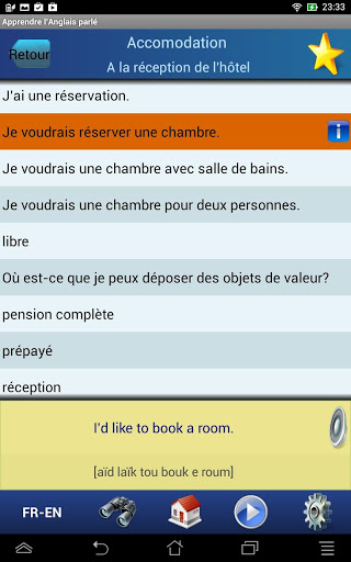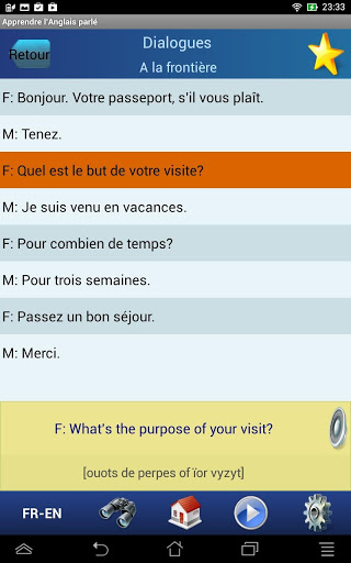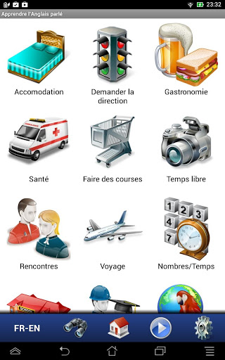 L'application est conçue principalement pour ceux qui s'intéressent à une maîtrise active de la langue anglaise. Tous les mots, les expressions et les dialogues ont été enregistrés par des locuteurs natifs de l'anglais. La division logique en 127 sujets et catégories avec un système de recherche rapide Vous permet de trouver instantanément un mot ou une phrase dont Vous avez besoin.