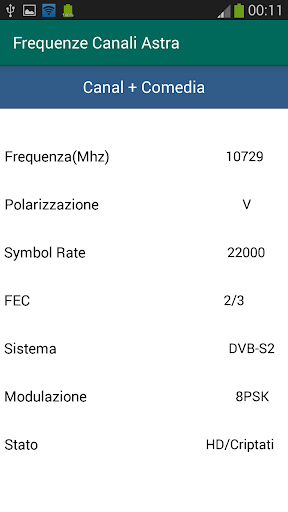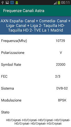 • Informazioni dettagliate per ciascun canale (frequenza - Polarizzazione - SR -FEC -Modulation -Sistema -. Stato del canale (SD o HD / crittografata o trasparente))