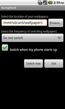 Randomly switches your background on predetermined intervals. Just select your wallpaper folder and decide how often you want your wallpaper to be switched, and BackgRand will take care of the rest.