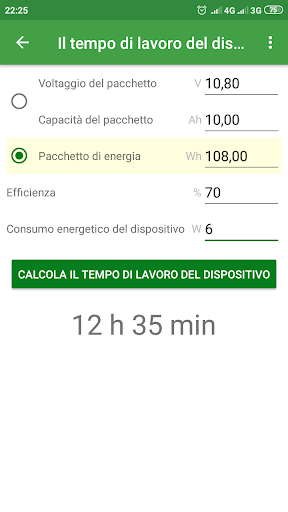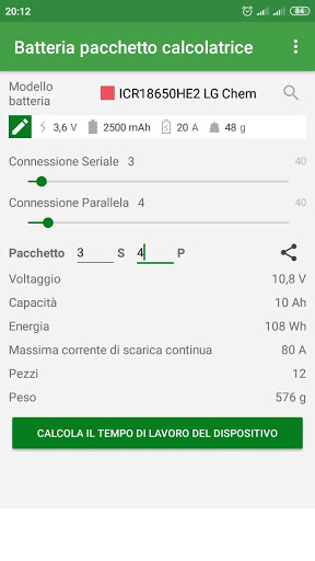 L'applicazione semplifica (per gli appassionati di bricolage e i professionisti dell'elettronica ) calcolare i parametri degli ioni di litio o di altri pacchi batteria.