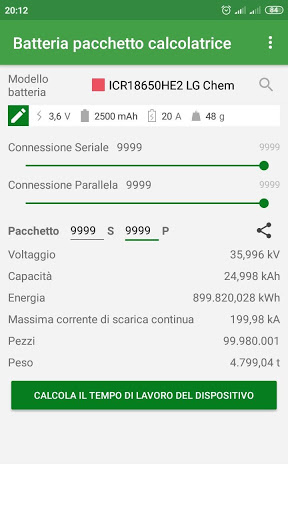 L'applicazione consente di calcolare pacchi batteria fino a 9999S 9999P - quasi 100 milioni di batterie :) Cosa ti permetterà di calcolare pacchetti per bici elettriche e pacchetti così grandi come per le auto elettriche (EV).