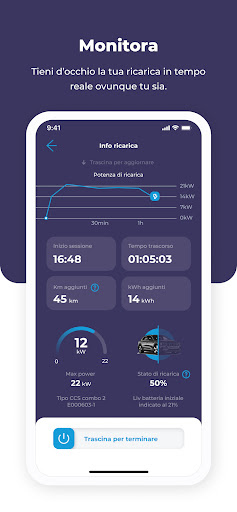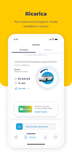 2. Monitora le tue ricariche elettriche real time: seleziona la colonnina e avvia la ricarica per avere tutte le informazioni di cui hai bisogno e controllare lo stato di avanzamento.