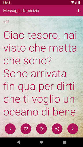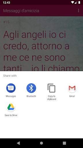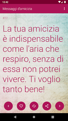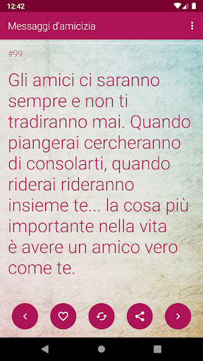 Si dice che gli amici siano i famigliari che puoi sceglierti. Con questa app puoi scegliere di inviare tramite Facebook, Twitter, email o con un semplice sms, un messaggio a un amico per consolidare e rimarcare l'importanza della vostra amicizia. Scegli tra un numero considerevole di frasi quella più adatta a te e ai tuoi amici; si passa dal comico al profondo, da semplici ringraziamenti a legami indissolubili, per offrire una soluzione ad ogni tipo di amicizia. Forza, che aspetti! L'amicizia è come questa applicazione: non va sprecata!