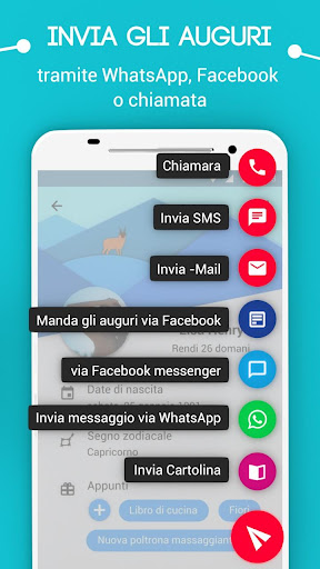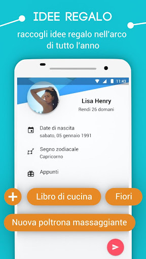 Riceverai notifiche puntuali per ogni compleanno. Il giorno stesso o, se si desidera, anche con qualche giorno di anticipo. L’app ti ricorda quale sarà il prossimo compleanno e ti propone varie idee regalo. Ti basterà premere sulla notifica per augurare un buon compleanno direttamente con WhatsApp o con un SMS o per accedere alla lista delle tue idee regalo.