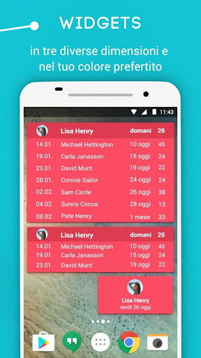 Coi widgets di questa app sulla tua home, avrai sotto agli occhi ogni compleanno, anniversario ed evento. Hai appena avuto una buona idea per un regalo? Premi sul widget e verrai automaticamente indirizzato all’app dove potrai prendere nota della tua idea o augurare un buon compleanno ai tuoi amici. Il conto alla rovescia ti mostra sempre il prossimo evento nella home. Sarai quindi al sicuro da ogni dimenticanza anche senza aprire direttamente l’app.
