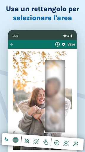 utilizzando la selezione sfocatura a matita/lasso è possibile utilizzare le dita per definire l'area da sfocare e nell'altro caso è possibile utilizzare l'area rettangolo regolabile,