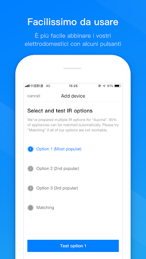 Con l'algoritmo AI e big data, BroadLink ti consiglierà le 3 opzioni IR più utilizzate in base alla tua regione e al tuo marchio. Ottieni il tuo elettrodomestico semplicemente ma accuratamente associato con solo pochi tocchi senza provare decine di opzioni. Prova l'IA più potente mai costruita per la vita solo con BroadLink!