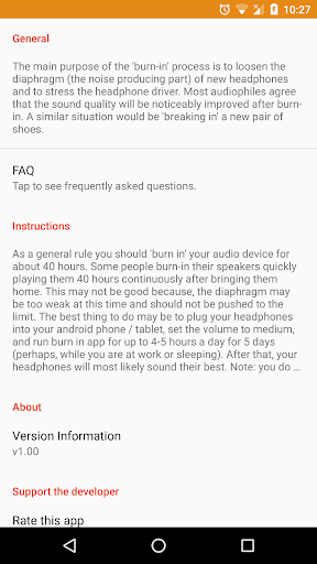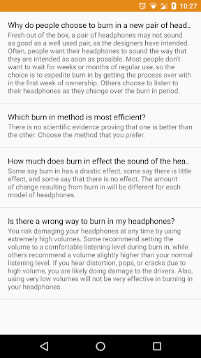 Come regola generale dovresti "bruciare" il dispositivo audio per circa 40 ore. Alcune persone bruciavano rapidamente i loro oratori che li giocano rapidamente 40 ore dopo averli portata a casa. Questo potrebbe non essere buono perché il diaframma potrebbe essere troppo debole in questo momento e non dovrebbe essere spinto al limite. La cosa migliore da fare potrebbe essere quella di collegare le cuffie nel tuo telefono / tablet Android, impostare il volume su Medio e eseguire Burn in app per un massimo di 4-5 ore al giorno per 5 giorni (forse, mentre sei al lavoro o Dormire). Dopodiché, le tue cuffie probabilmente seguiranno il meglio. Nota: non è necessario ascoltare tutto il tempo.