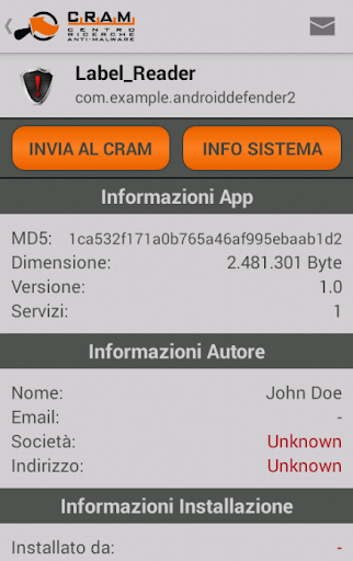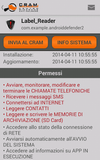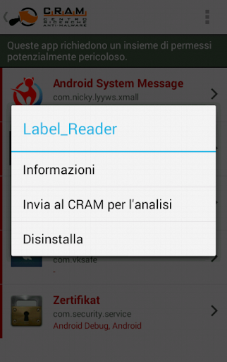 Infine, è anche possibile inviare la lista delle app installate sul dispositivo al CRAM (Centro Ricerche Anti-Malware) della TG Soft per l'analisi, qualora si sospetti che il dispositivo sia infetto da qualche malware. I ricercatori del CRAM provvederanno ad analizzare la lista delle app installate, dando priorità di risposta ai casi in cui dovessero essere individuate app potenzialmente malevole. Trattandosi di un servizio fornito gratuitamente, la risposta (via email) avverrà compatibilmente con le altre attività svolte dal CRAM.