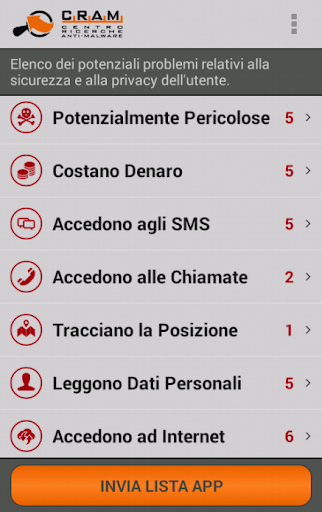 Cliccando su una qualsiasi delle voci sopra citate, si accederà alla lista delle app interessate (in rosso se sospette o potenzialmente pericolose).