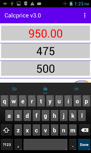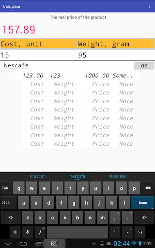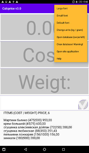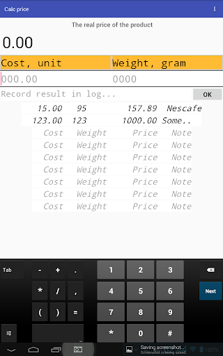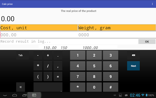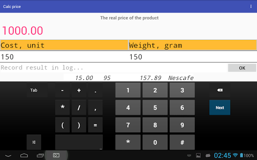 Tutto lo stesso la nostra applicazione. Ma ha già una formula per questo calcolo e una parte automatizzata dell'azione. È sufficiente iniziare a inserire il numero di prezzo e peso, poiché nel campo superiore appare il totale terminato.