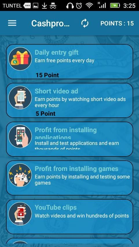 حيث يمكن جمع النقاط من خلال عمل مهمات بسيطة مثل تحميل التطبيقات ؛ مشاهدة فديوهات قصيرة؛عمل تقييم ؛تجاوز اختصار الروابط ؛ كما توجد هدايا يومية و شهرية