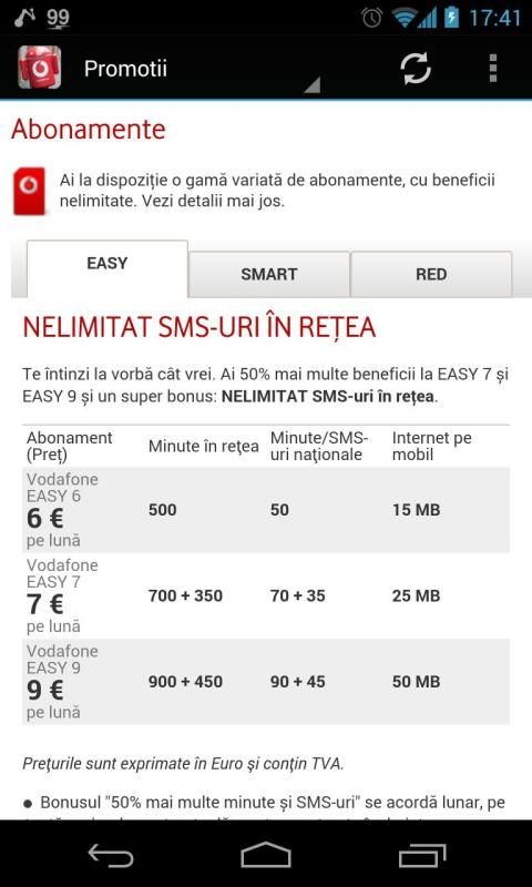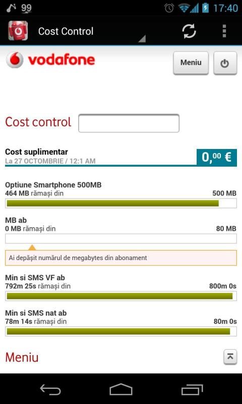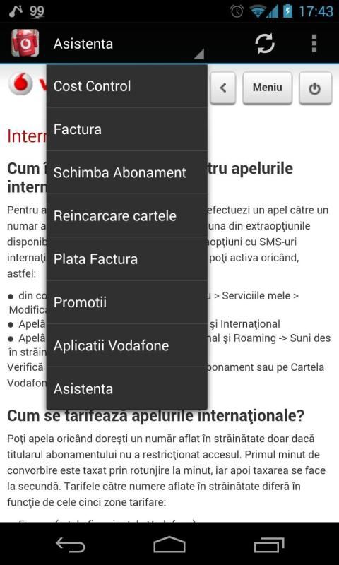 Alternativa la aplicatia oficiala de la Vodafone. Veti putea accesa detalii despre factura , apeluri, cost-control , reincarcare cartela , aplicatii Vodafone , schimbare abonament , promotii. Pentru a putea beneficia de toate acestea trebuie sa aveti un cont activ pe vodafone.ro ![vodafone](https://apps.opera.com/prodimg/358247_screenshot_3.png "romania") ![vodafone ro](https://apps.opera.com/prodimg/358247_screenshot.png "") ![vodafone](https://apps.opera.com/prodimg/358247_screenshot_4.png "")
