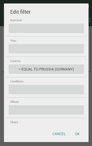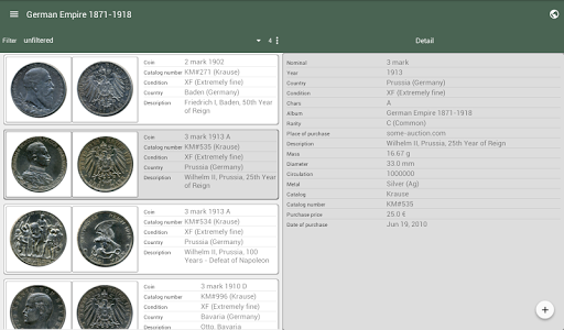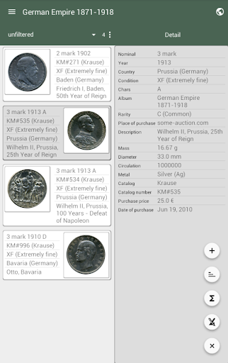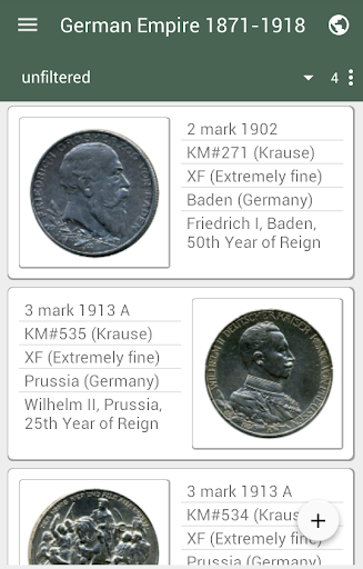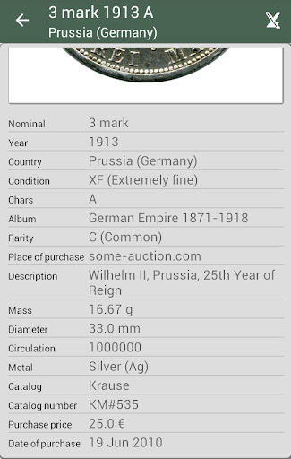 L'applicazione non è una directory. Progettato per la catalogazione della tua collezione di monete. Inoltre puoi usare questa app per la raccolta di francobolli e banconote.