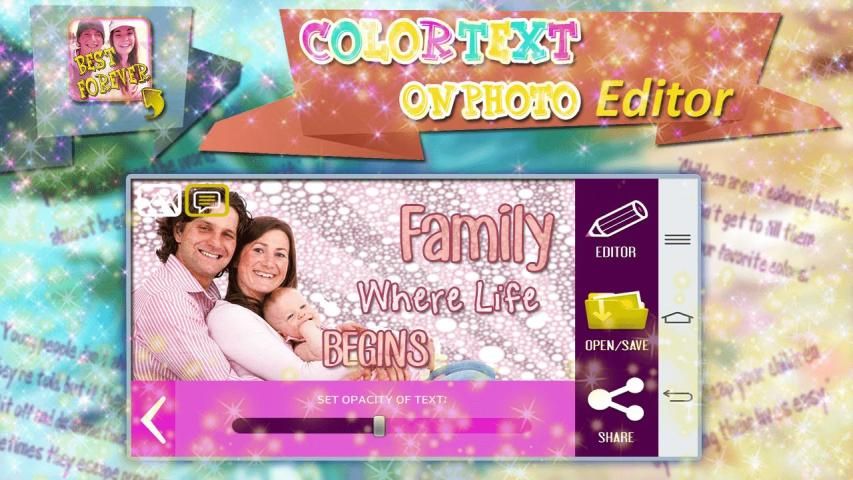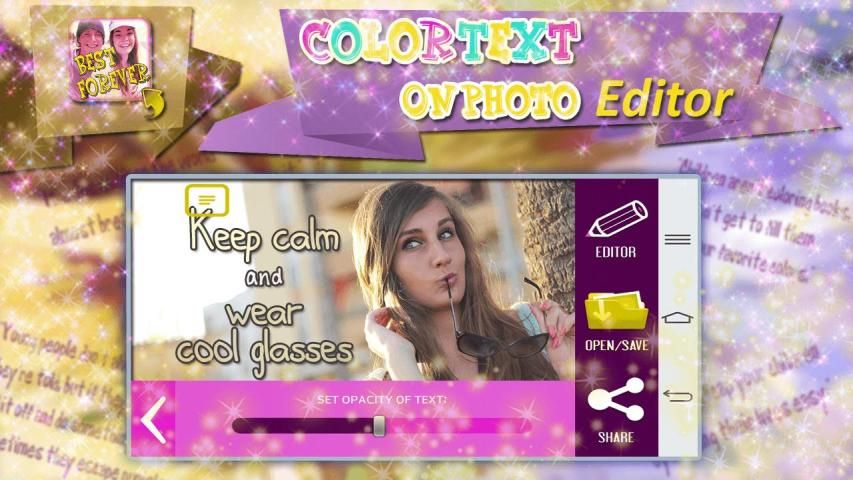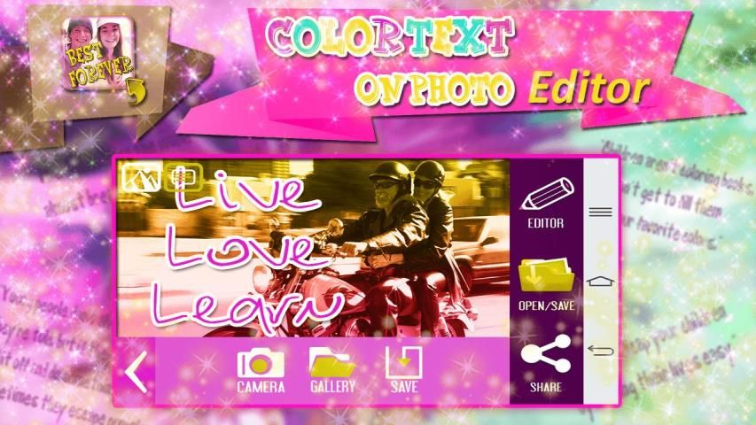 ☀ Open your imagination and start with creative “photo editing”! Download ☀ Color Text On Photo Editor ☀ and start adding some insta text – now! Funny photo effects and picture templates will beautify your cute pics with a wide choice of text fonts and all colors of the rainbow! You can choose from a variety of photo borders and picture frames!