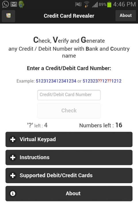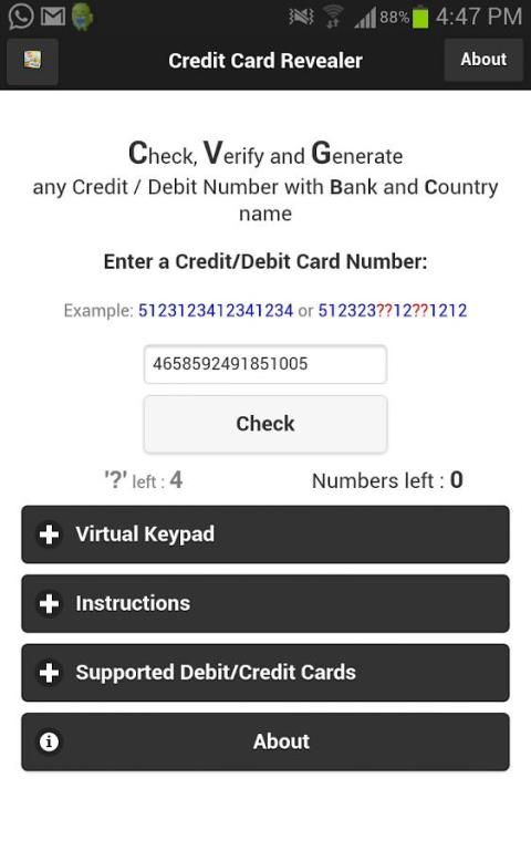 Do you want to find and generate any bank's credit card numbers? Do you want to verify a credit card? Do you want to reveal the details of any Credit Card? Now you can generate up to 4 missing numbers of a credit card. so, Try this app. Hack a Credit/Debit Card with this app.