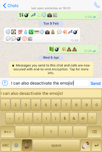 - Funziona con qualsiasi applicazione che utilizza una tastiera (cioè whats up, messaggero, messaggi, ecc.) Per codificare o crittografare i tuoi messaggi - è possibile selezionare un set diverso di emojis (discreto o divertente) da inviare professionale Messaggi o solo per divertimento!