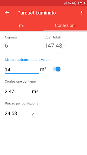 • Laminato: Metro quadro, supplementare, Costi totali.