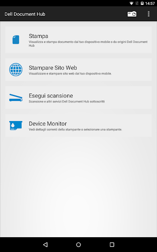 Dell Document Hub è una comoda soluzione su cloud che consente di semplificare la collaborazione sui documenti. Progettata principalmente per le stampanti laser Dell, questa app consente di eseguire una scansione e stampare da una varietà di servizi comuni di memorizzazione su cloud. L'uso di questa app consente di connettersi comodamente a tali servizi su cloud e attivare la stampante Dell compatibile per eseguire stampe, scansioni e conversioni mobili di documenti verso file modificabili e ricercabili con riconoscimento ottico dei caratteri (OCR). È inoltre possibile visualizzare lo stato della stampante e configurare le impostazioni di scansione e stampa. La nuova funzionalità di acquisizione della fotocamera consente di scattare e stampare/memorizzare.