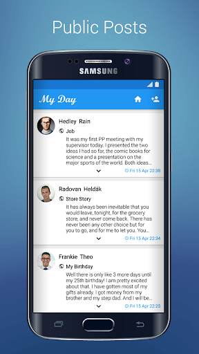 My Day Diary is an easy-to-use free app that lets you save and store your own thoughts, memories, secrets, life events or notes. You can sync and backup all yours memories on My Day Server, so you can access your memories across all your Android devices. What’s more, you can share your memories with your friends or family!