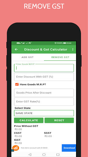 Prima devi scegliere la frequenza fiscale GST e quindi è necessario inserire il mRP e il valore di sconto e l'app calcolerà la quantità o il prezzo dopo lo sconto. Quale importo apparirà app mostrerà il valore senza GST significa che rimuoverà GST dal valore. Quindi puoi ulteriormente il valore fiscale su quel prezzo.