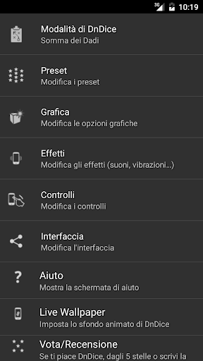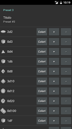 * 10 Preset modificabili (nome, numero, tipo e colore dei dadi) e selezionabili velocemente.