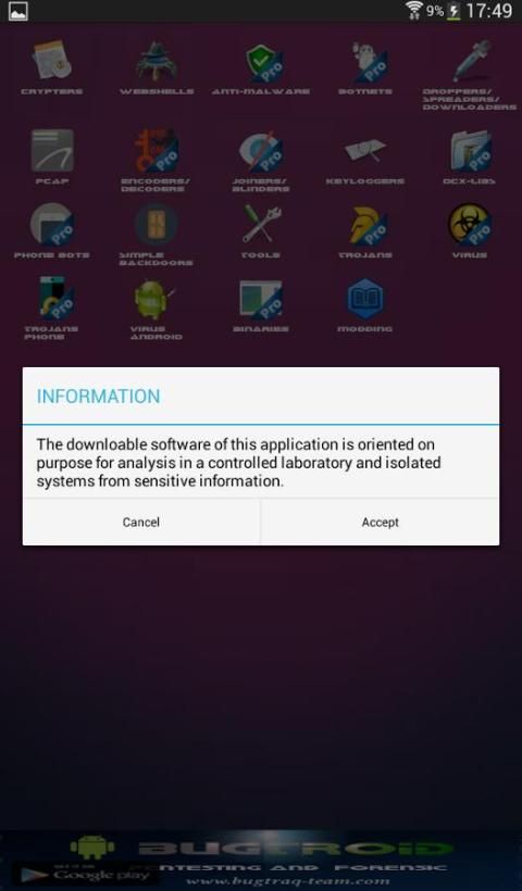 Droidbug Haunter is the unique APP for Android with more than 500 tools in malware laboratory for its analysis and lab.
