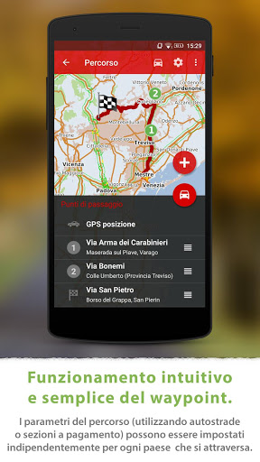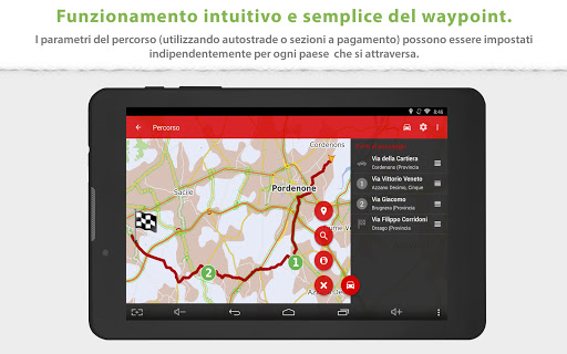 • Pianificazione avanzata dei percorsi con waypoint con la possibilità di evitare le strade a pedaggio in determinati paesi o lungo l'intero percorso