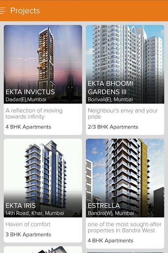 Il più recente lanciato Ekta Tripolis a Goregaon West è stato ben accolto nella fraternità e dai consumatori. Avere lussuosi appartamenti 2, 3 e 4 camere da letto situati strategicamente fuori dalla strada di Link è stata la destinazione più ricercata. E Ekta Parksville, in Virra, ha ricevuto una risposta fenomenale con la fase I & Phase II completamente esaurita in pochi mesi di essere lanciata. Ciò particolarmente soddisfatto del gruppo di reddito medio e ha sostituito strategicamente il loro tenore di vita a quello del grande stile di vita della città. Questo è stato seguito dal lancio dei nostri progetti ultra lussuosi, progetti Ekta Invictus & Ekta Olympus & Ekta Oculus a Dadar & Chembur rispettivamente, in mostra uber Cool 4 camere da letto per la crème de la Crème.
