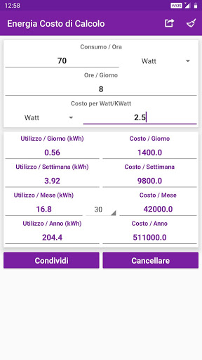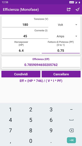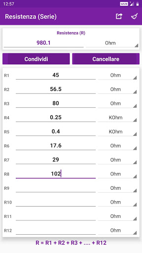 • Valori e risultati calcolati possono essere condivisi con social media, posta, messaggi e altre app di condivisione.