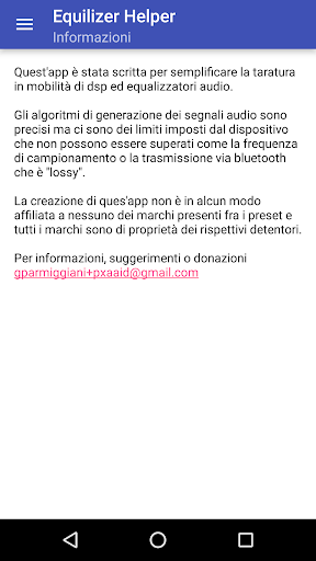 "Equalizer Helper" nasce con l'intento di aiutare nella taratura in mobilità di dispositivi audio dedicati al Car HiFi e contiene già alcune preimpostaioni (preset) di alcuni dsp ed equalizzatori comunemente usati.