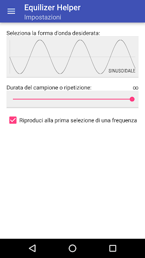 Il generatore di segnali utilizza la massima frequenza di campionamento disponibile sul dispositivo Android, spesso è anche l'unica, e per ora si limita a creare un onda sinusoidale. Una volta selezionato un preset nella schermata principale comparirà un elenco di frequenze suddivise in 3 colonne: la prima per generare un segnale sul solo canale sinistro, quella centrale per avere un segnare stereofonico e la terza per il solo canale destro.