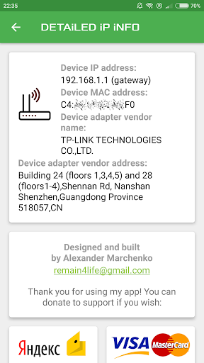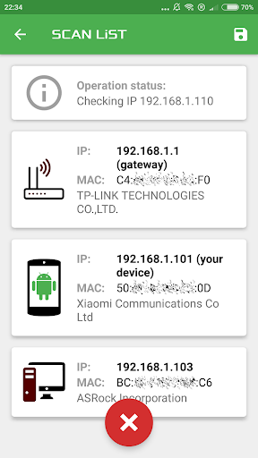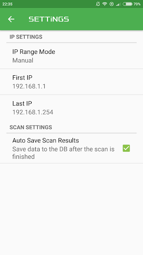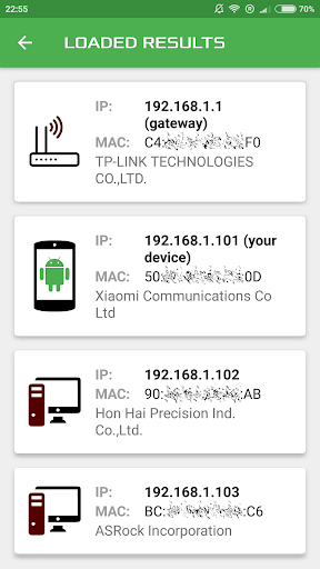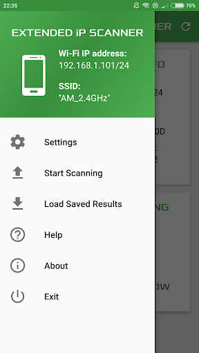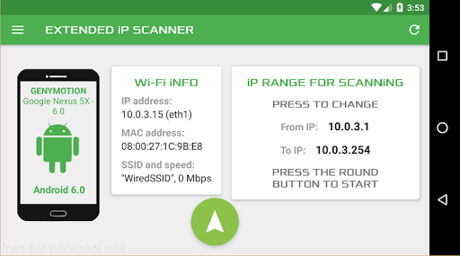Lo scanner IP esteso consente di trovare dispositivi collegati alla rete Wi-Fi e ottenere il loro IP, Mac e informazioni sul fornitore dell'adattatore di rete.L'intervallo di scansione viene calcolato automaticamente in base all'IP corrente del dispositivo, che è possibile visualizzare sulla schermata principale insieme a ulteriori informazioni (modello, versione Android) e dati di connessione Wi-Fi (nome adattatore di rete, SSID, velocità di collegamento).È possibile modificare la gamma IP o aggiornare i dati Wi-Fi con semplice clic sul campo della schermata appropriato.Inoltre è possibile salvare e caricare per data Tutti i risultati della scansione necessari.Questa app è completamente gratuita per l'uso non commerciale.