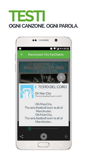 tutte da ascoltare, inviare agli amici e usare come suonerie per il tuo smartphone. Ricevi le notifiche per nuovi cori dei Tifosi di Manchester City e utilizza la funzione di registrazione integrate per inviare nuovi
