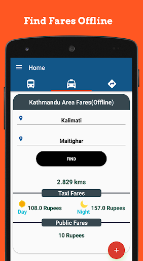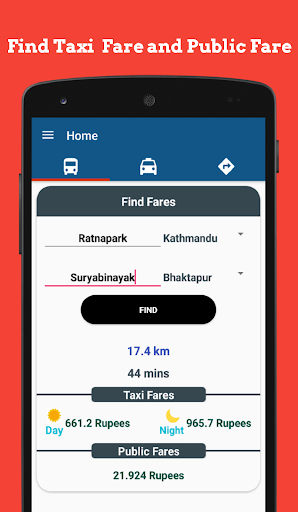 Fare Finder Nepal (Works both online and OFFLINE) helps you to find out day and night taxi fares (Bhadadar) and public transportation fare in Kathmandu, Bhaktapur and Lalitpur,