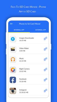Fast and easy find movable apps and move them to SD Card to free some space on your phone Internal Storage! This is a quick solution to transfer the files from the internal memory to the SD card in your phone. In one click, you release the space in the internal memory of your phone.
