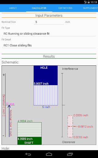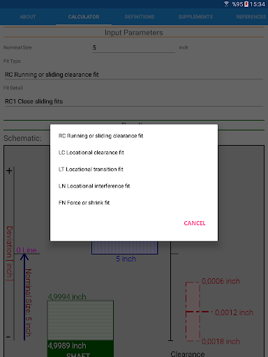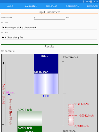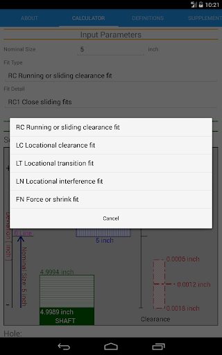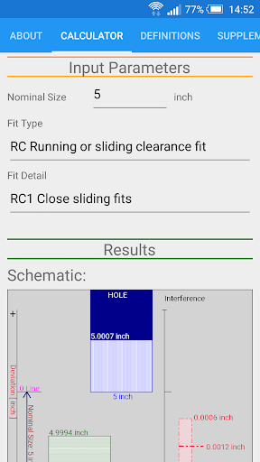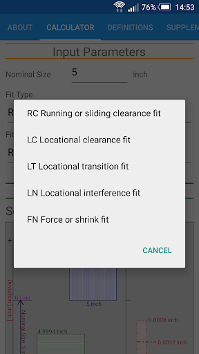 Limiti standard di ANSI e calcolatrice FITS Funziona in linea con standard ANSI B4.1-1967 (R2004) che è basato su unità di pollici.Secondo i parametri di input della selezione nominale della dimensione nominale e del tipo di adattamento tra la corsa e lo scorrimento [RC], la clearance della localizzazione [LC], la transizione della localizzazione [LT], l'interferenza della localizzazione [ln], la forza e la forzatura [fn] si adattano, i limiti delle dimensioni del foro/ L'albero è calcolato.
