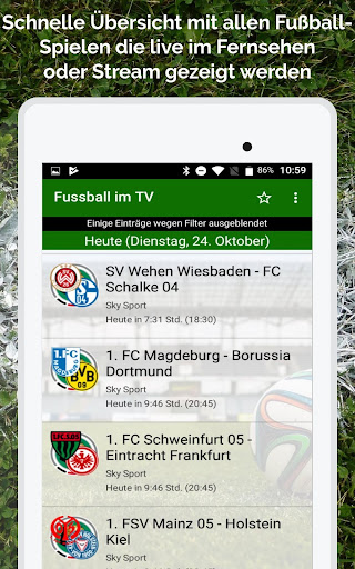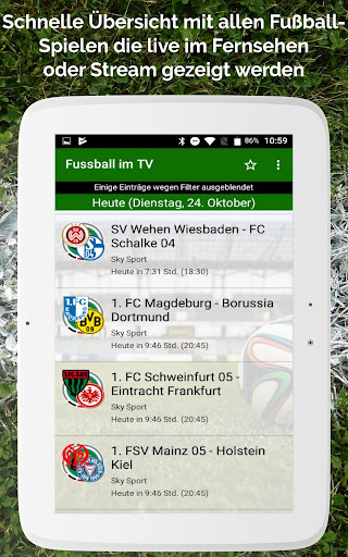 Questo calendario mostra i giochi di calcio che vivono in diretta in televisione tedesca, ad esempio su ARD, ZDF, RTL, SAT1, Kabel1, Sport1 ecc. Eravamo sotto il nome & quot; calcio in FreeTv & quot;Hanno elencato solo i giochi sulla televisione free-recent, i canali di pay TV come Sky Sport, Sky Sport Bundesliga, Dazn, Telekom Sport ed Eurosport Player sono ora nella lista a causa di molte domande.Con la funzione di filtro esistente, questi possono ovviamente essere facilmente nascosti.Inoltre, sono elencati anche i giochi che sono mostrati nel live streaming, ad esempio dal DFB o Laola.