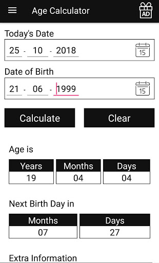 Il calcolatore dell'età è un'altra delle migliori caratteristiche dell'app Calcolatrice in cui puoi calcolare la tua età in anno, mese, settimane, giorni, ore, minuti e secondi. Inoltre puoi mostrare il tuo prossimo compleanno per giorni per i prossimi 10 anni con giorni.