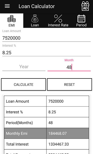 Calcolatore EMI prestito ha anche la funzione di Calcolatore prestito con cui è possibile calcolare EMI prestito, importo del prestito, Tasso di interesse del prestito, durata del prestito, importo della rata del prestito e calcolo dell'EMI su base mensile e annuale.