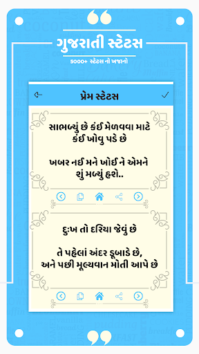Questa applicazione contiene Best and Ultime Gujarati Shayari, stato e messaggi nella lingua Gujarati. Ha una grande collezione di status di Gujarati per tutte le occasioni per lo stato di aggiornamento giornaliero veloce nei siti sociali e per qualsiasi applicazione di chat ecc.