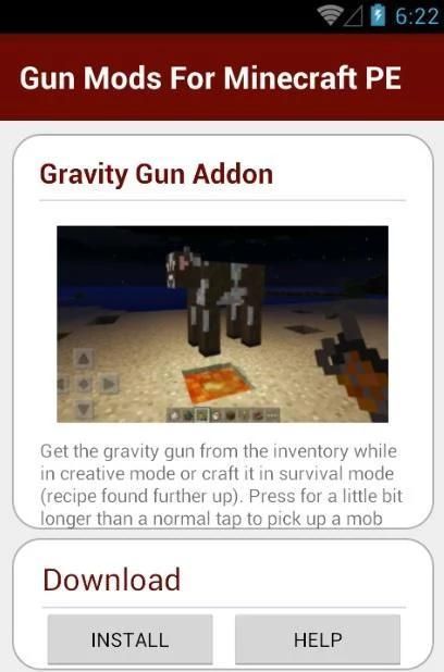 Gun Mods For Minecraft PE Get the gravity gun from the inventory while in creative mode or craft it in survival mode (recipe found further up). Press for a little bit longer than a normal tap to pick up a mob and make it levitate. To throw the mob tap on it once again and it will catapult away. You can also use the gravity gun to push the mob a few meters away. Just tap on the mob and it will be pushed away.