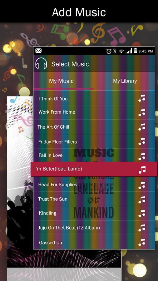 >> Add Music from your music library to set your song in video for this app.