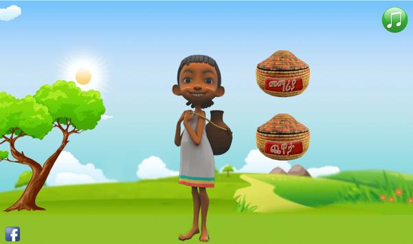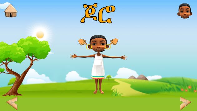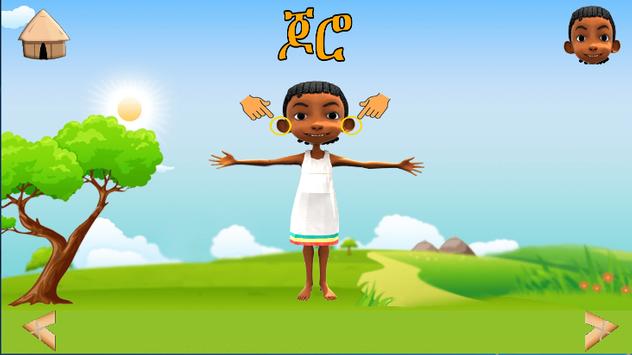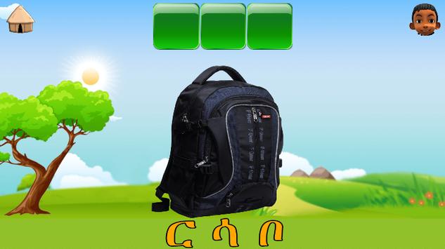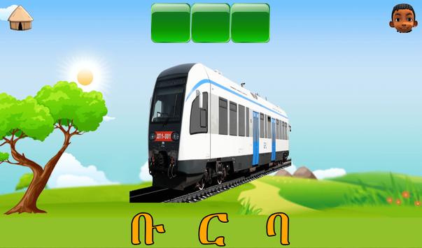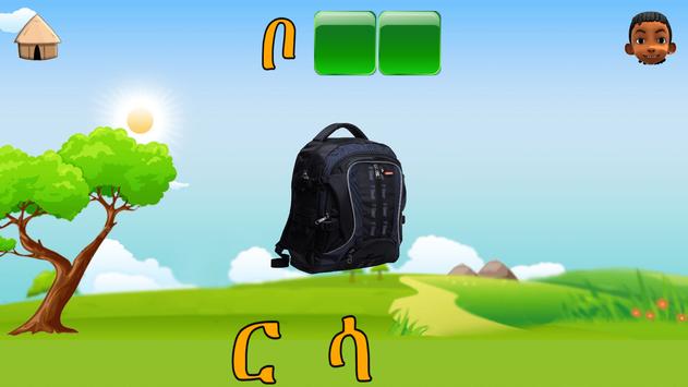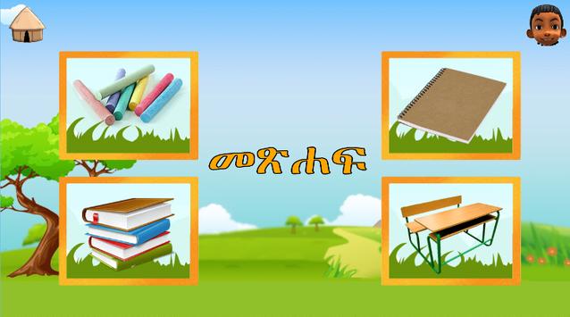 The game section contains matching of words and puzzles in which children have to rearrange missed-placed Amharic alphabets to solve the puzzle.